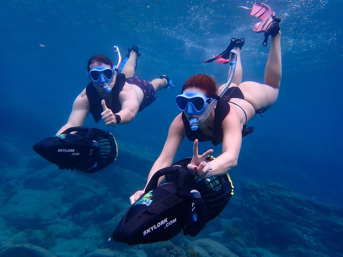 Snorkel in style with a battery powered eco friendly sea scooter. Encounter lots of tropical marine life. Swim with turtles and rays in the wild. Spend less effort and see more! Scooter Snorkeling Antigua Tour is a snorkeling excursion with a battery powered sea scooter. We use the Seadoo RS1 model scooters which are currently the best underwater scooters in production. Our scooters can propel adults up to 4 mph. Whether you intend to cruise across the surface of the clear blue waters of the Pillars of Hercules in the Caribbean sea, or, dip below the surface for a thrill, Scooter Snorkeling is must do activity in Antigua!